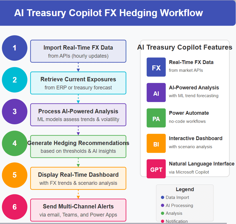 - Example AI prompt: “Based on the last 30 days’ FX rate trends, news sentiment, and current exposure, should we hedge EUR/USD today?”