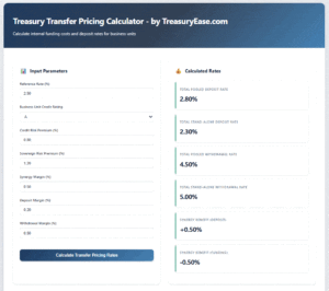 Try it yourself: To help you put theory into practice, we’ve created a free, interactive Transfer Pricing Calculator. This tool lets you input your entity-specific parameters—like credit rating, country risk, and internal margins—and instantly calculates both withdrawal and deposit rates. It’s a practical way to explore how internal pricing works and how synergy benefits impact your treasury spread.